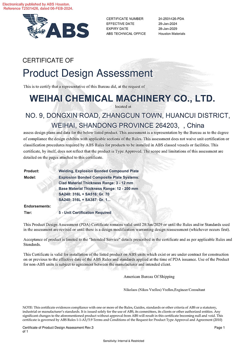 近日,威?;瘷C(jī)順利獲得美國(guó)船級(jí)社(ABS)頒發(fā)的產(chǎn)品設(shè)計(jì)PDA認(rèn)可證書,認(rèn)可產(chǎn)品名稱為“爆炸焊接復(fù)合板”,涵蓋產(chǎn)品種類:ASME SA264、ASME SA265、ASTM B898標(biāo)準(zhǔn)…
